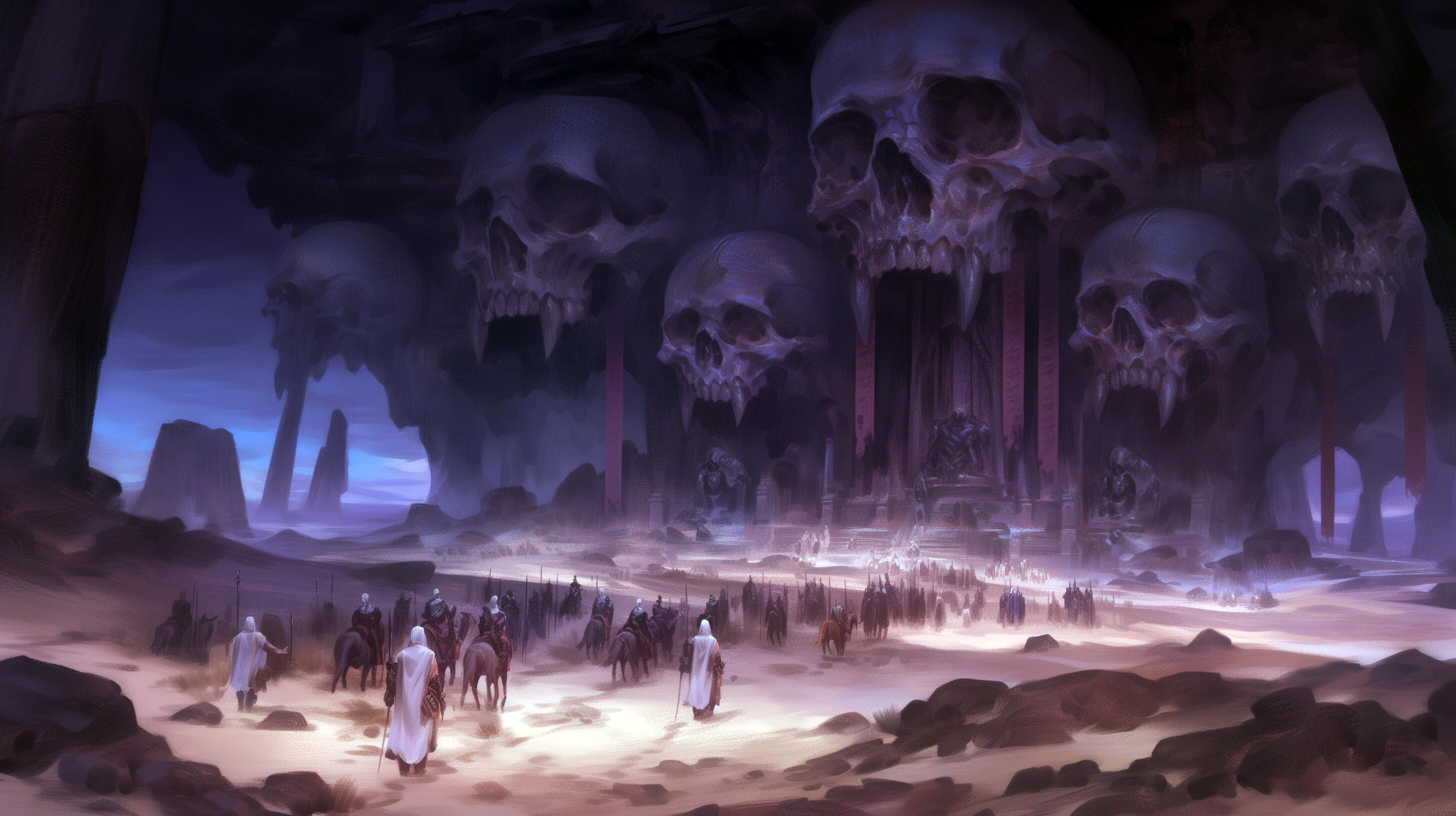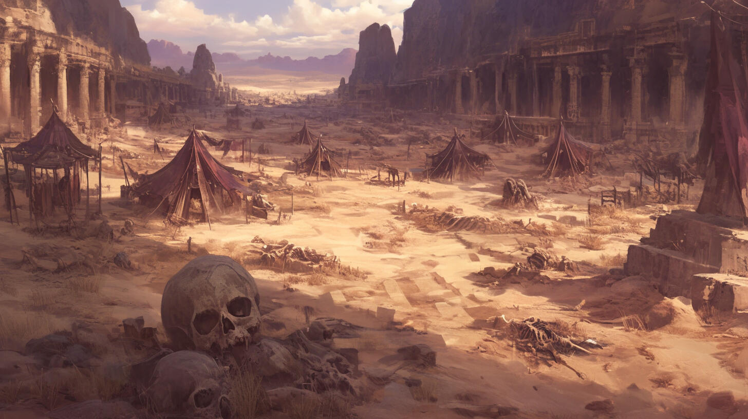 Geography & Climate: Harsh desert wasteland with scorching days and freezing nights. Rocky badlands, sand dunes, and occasional oases. Massive skeletal remains of ancient beasts dot the landscape. Frequent deadly sandstorms.
