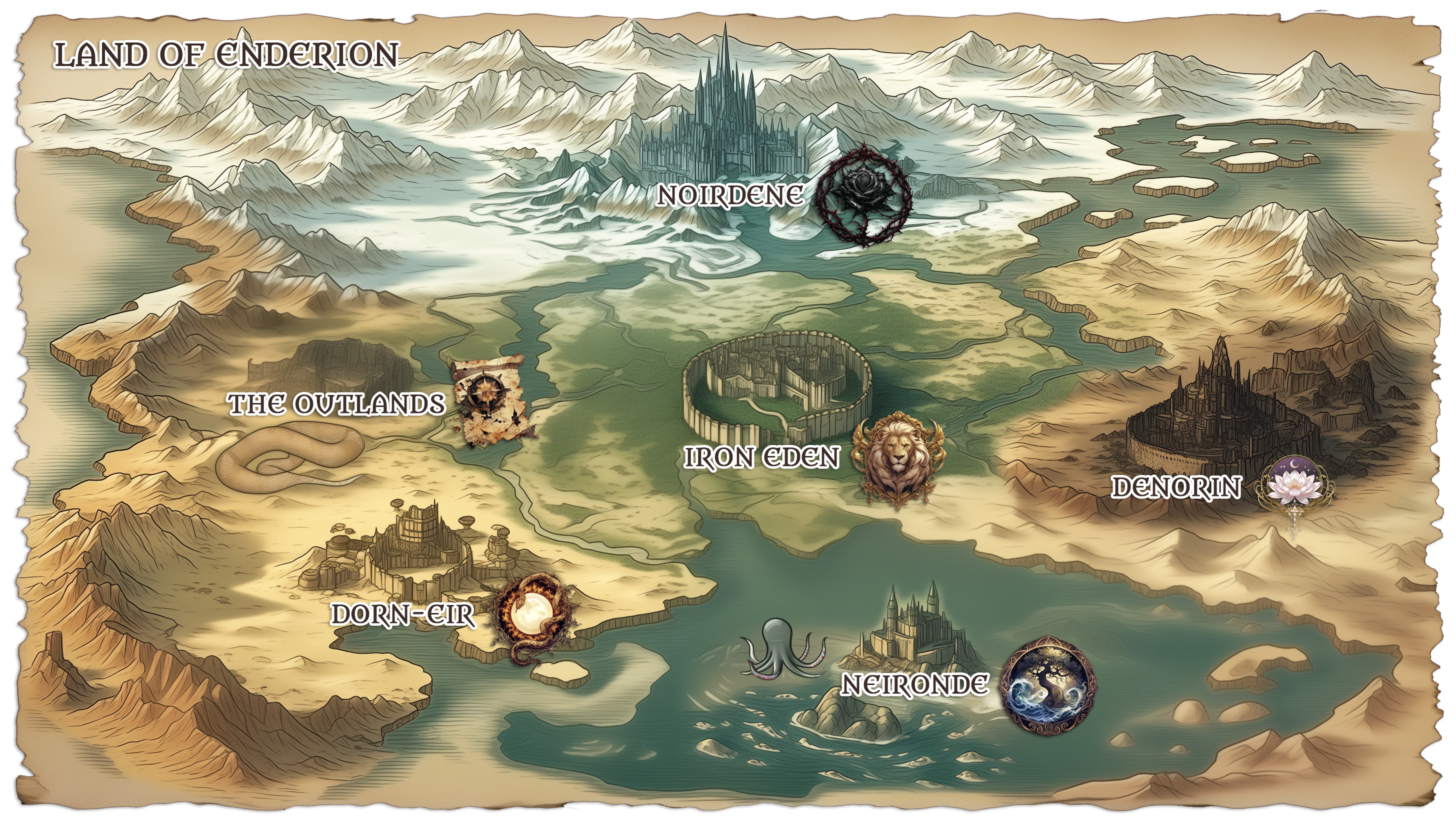 An expansive, unknown land shrouded in mystery. A popular destination for expeditions and adventurers seeking fortune and discovery. Currently overseen by the Enderion Guild Alliance, a collective of adventurer guilds across the land of Enderion.Its sigil represented by a compass and a worn map. Banners in faded yellow and black.The Outlands can be accessed from all kingdoms, though the Frontier's Edge in Iron Eden serves as the primary departure point for expeditions.