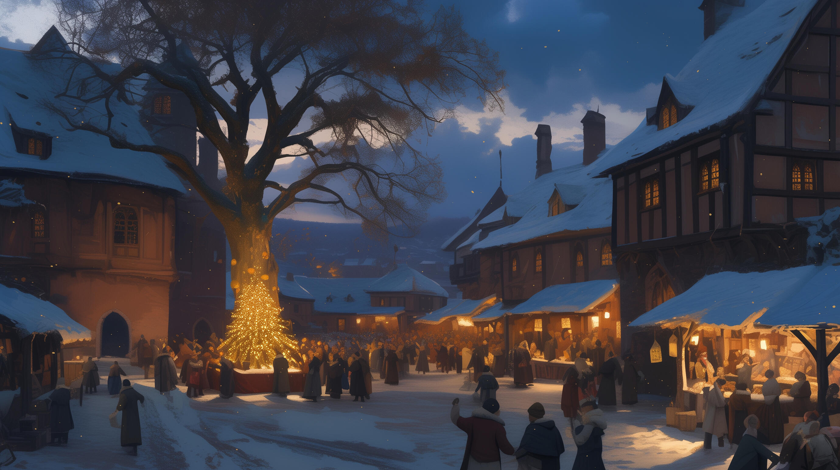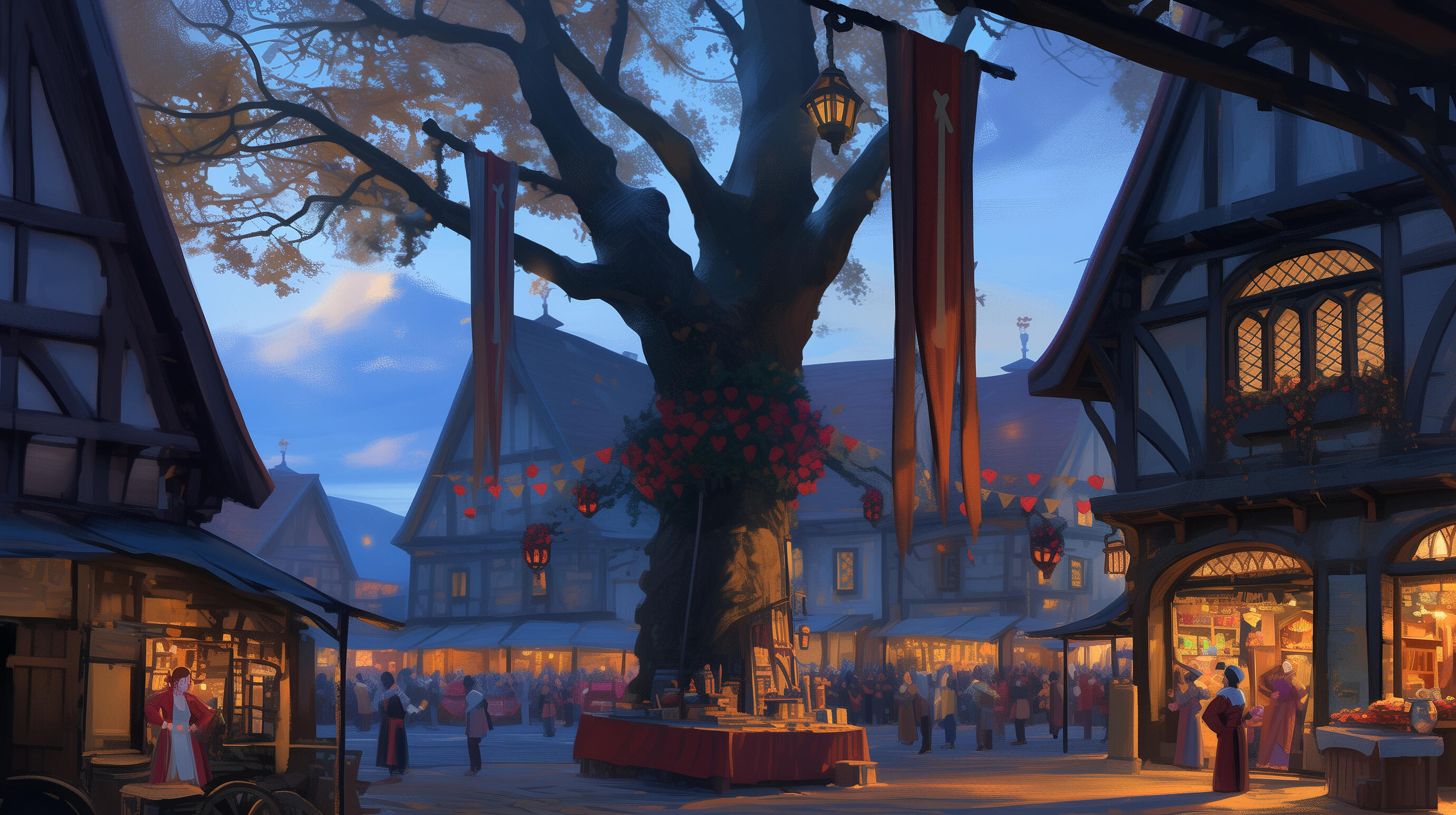 Annual end-of-year festival in Iron Eden. Large bonfire in Market Plaza with dancing. Traveling merchants set up stalls selling exotic food, trinkets, and gifts around the plaza edges. Highlight: Big dance relay where partners switch every few seconds until the traveling band's medley ends. Prime event for meeting potential partners and friends.